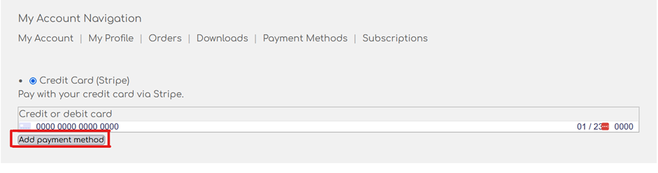 - Click on 'Add payment method'. Enter your card details, and click 'Add payment method' to confirm: